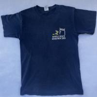 ID: a navy short-sleeved t-shirt with white lettering on both sides. On the front left side of the chest, there is a title “Myrtle Beach Marathon” with a pelican running across…