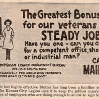 A Magazine ad promoting a good bonus for veterans is a steady job. This is right after WW1 and is from the American Legion Employment Bureau which is pro veterans since it started from them post WW1. The ad is pushing the idea of a steady job being…