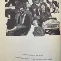 A collage of images of a Man and a Women in a car. The women has no eyes, the man is chasing the women beside the car. Underneath a poem says “Reminding us all the while that when driving down the highway with a friend who says he wants to get off at…