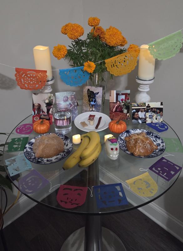 This still image shows a finished altar, called an ofrenda, an important aspect of Dia De Los Muertos. On the alter are five different photos: four photos are loved ones of the Fernandez-Martinez family and Mancillas family. Including in the alter is a photo (center) of the family dog, who passed away two years before. The altar is filled with food such as bananas and pan de Muertos (Bread of the Dead), mirroring each other, and a variety of dog treats all to represent favorite foods of those on the altar. The altar is decorated with Cempasuchil flowers, Aztec Marigolds, in the background, which are accompanied by lit candles on each side. Other decorations include color banners above and, on the altar, a sugar skull, and pumpkins to match the Mexican tradition and fall season.