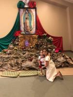 Two young girls are kneeling and hugging in front of a decorated altar dedicated to the Virgin of Guadalupe. The altar has a large, framed image of the Virgin of Guadalupe surrounded by red, green, and white fabric draped behind the framed image. The altar has brown paper to represent rocks; it is decorated with flowers and a small water fountain. The girls are dressed in traditional Mexican dresses.