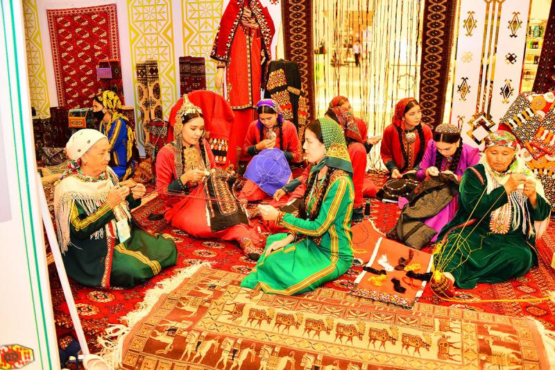 Young girls and womenare gathered to waive a carpet, and other Turkmen handicrafts such as yaglyk, alaja , korpence. In the picture on the left side one young girl dressed in a green Turkmen dress holds the string for old woman who is preparing import things for carpet weaving. On the right side of picture green dressed women making alaja .