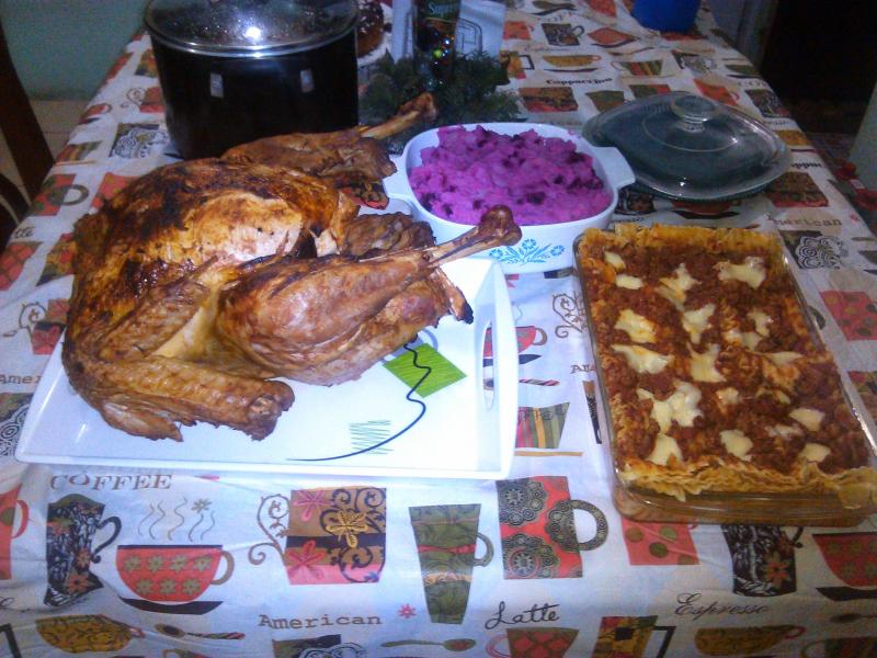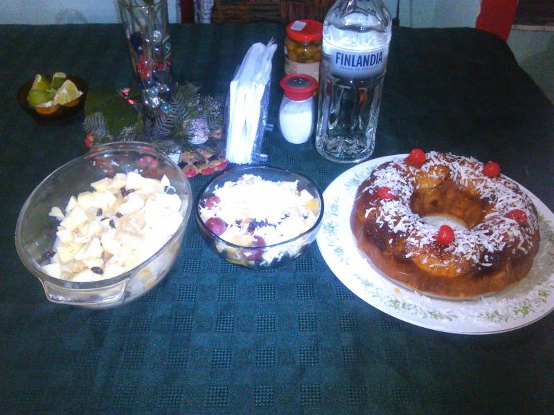 These still images shows the cultural foods of an El Salvadoran tradition and the photos display the foods on a dinner table. The first image shows a picture of a baked hen, pink princess salad, a pan of lasagna, and a slow-pot roast in the background. The second image shows the deserts, which are apple salad, fruit salad, and a Rosca de Pascua, traditional dessert