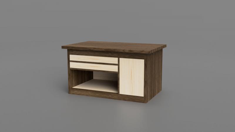 This is an image of a console table that was computer rendered. Every part in the model was designed with building the model in mind. As rendered, it has a dark wood top and sides with two drawers with a light front. It also has a side door with for additional storage. The digital model includes physical plans.