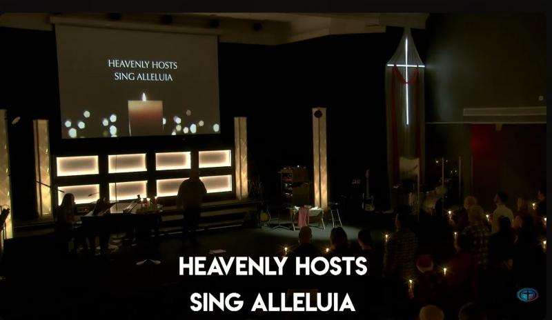 This is an screencapture of a recorded Christmas Eve church service at Hampton First Baptist Church in Hampton, Georgia, taken from an angle that allows one to see most of the sanctuary. It shows all the seats being filled with people holding lit candles while singing along to the song "Oh Holy Night." Most of the lights are off, and on stage is the pianist and the pastor.