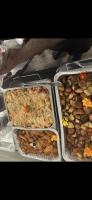 This image shows/represents the preserved familial food ways of the Henson Family. Created by Michael Henson, 3 beautiful dishes in this image with edible flowers as decorations, catered for a baby shower. In the bottom left corner there are some homemade Honey Siracha wings, In the top left, there is a pan of delicious Baked Pasta Casserole, and lastly on the right-hand side there is a beautiful display of oven roasted baby potatoes topped with a Garnish.