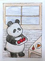 The second image is Mr. Panda preparing his ancestors’ favorite dishes at home. The table is filled with many dishes, and two candles are lit. On the table, there is a plate of bright and fresh oranges. Mr. Panda is bringing a plate of three red apples to the table. In the background, there is a window looking out to the blue, cloudy sky.