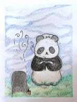 The first image is Mr. Panda kneeling on the green grass, praying his respects to his ancestors at their gravestone and holding three joss sticks. The sky is cloudy and blue because during this time, it is often followed by three days of rain. A panda is chosen instead of a realistic person because a panda is an important animal symbolizing China.