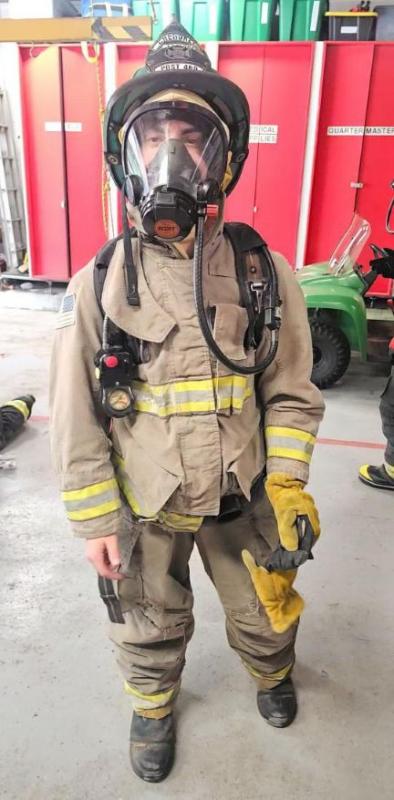 This still image features of a fire cadet stands pauses to face the camera during firefighter training. During training, recruits are getting a workout and feeling how their SCBA (self-contained breathable apparatus) works. The cadet in the image is breathing air and has a full set of turnout gear on. He has one glove on, and his gear is worn down. In the background, there are many red storage lockers, other black parts of gear, and the front of a green gator 4x4 vehicle. Cadets use this training to get used to the weight and learn how to move with heavy gear on, and instructors give physical exercises to the cadets.