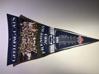 This still image depicts the pennant celebrating the championship win of the Australian Football team (Geelong Cats) each with a medal around their neck, holding trophy for winning a championship. Players are gathered celebrating winning, dressed in blue striped uniform, sat down in the field where they just finished playing the match.