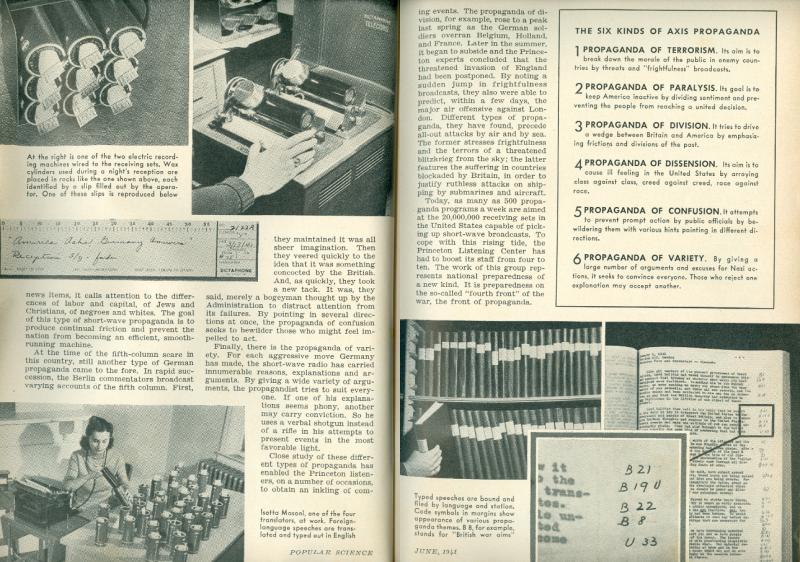 This is an article that was written in 1941, a time where the U.S. had joined in the battle of World War II, the title reading "America Listens IN", indicating recording of European Radio Program, revealing propaganda in Germany. This article is only 4 pages in the month magazines named Popular Science, where it also includes ads and information on automobiles, home & shops. and mechanics.