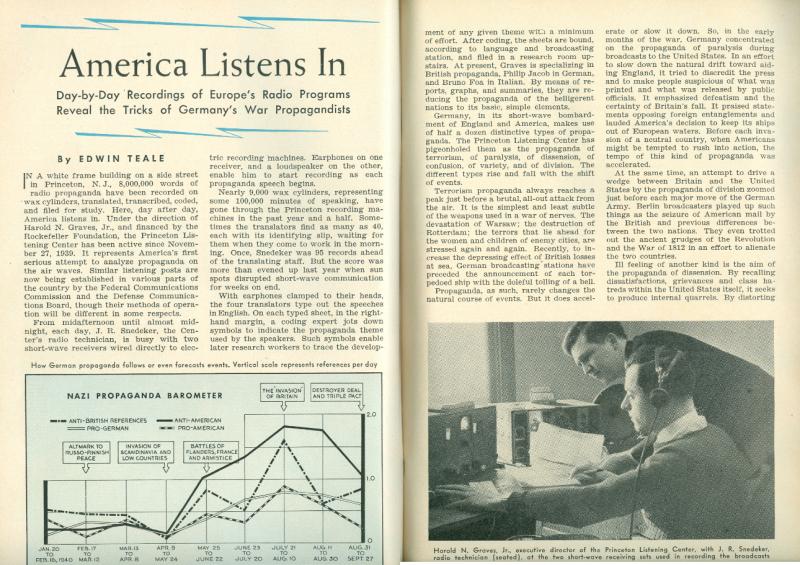 ID: On the 1st page, it includes text describing the process of recording war propaganda, while showing a graph titled "Nazi propaganda Barometer" showing different level of propaganda at different points in the war. It goes on to show 2 images of recording machines being used by at least 2 people, having only one identified as Isotta Masoni, a translator, and also a third photo of 2 mean identified as Harold N. Graves, who is hunched over but standing to the left of J.R. Snedeker, who is sitting with headphones on listening and recording broadcasts.