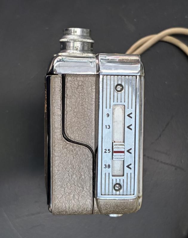 ID: The top of the camera has a “Slide-o-matic View-Finder Button” with the numbers 9, 13, 25, and 38. The left side of the camera has two turn knobs, a sliding operating button, and a winding key. The front of the camera includes the lens and a turning knob to unlock the camera. The right side of the camera has a short exposure guide manual for colored subjects. Lastly, a wrist strap is located at the bottom of the camera.