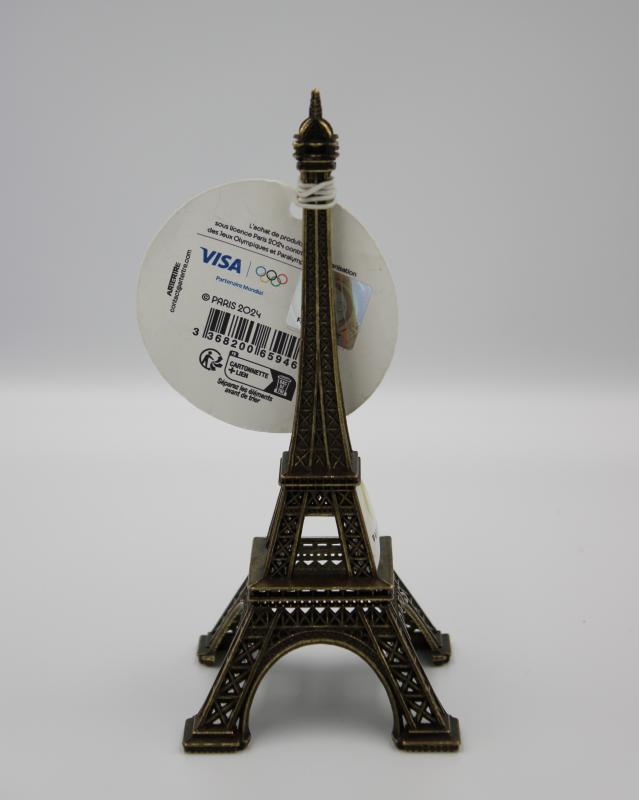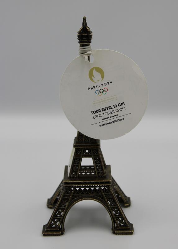ID: Brown metallic Eiffel Tower figurine with words "PARIS" and "MADE IN FRANCE" incorporated within the design. The front having a white attachment on the middle of the tower, with the yellow Olympic France logo, the multicolored Olympic rings, and "PARIS 2024" on it. Attached at the top of the tower is a white tag with the two logos, and "PARIS 2024." Below that, it states that it is 13 cm and has a website link. On the back, in French it states that it is an official Olympic product.