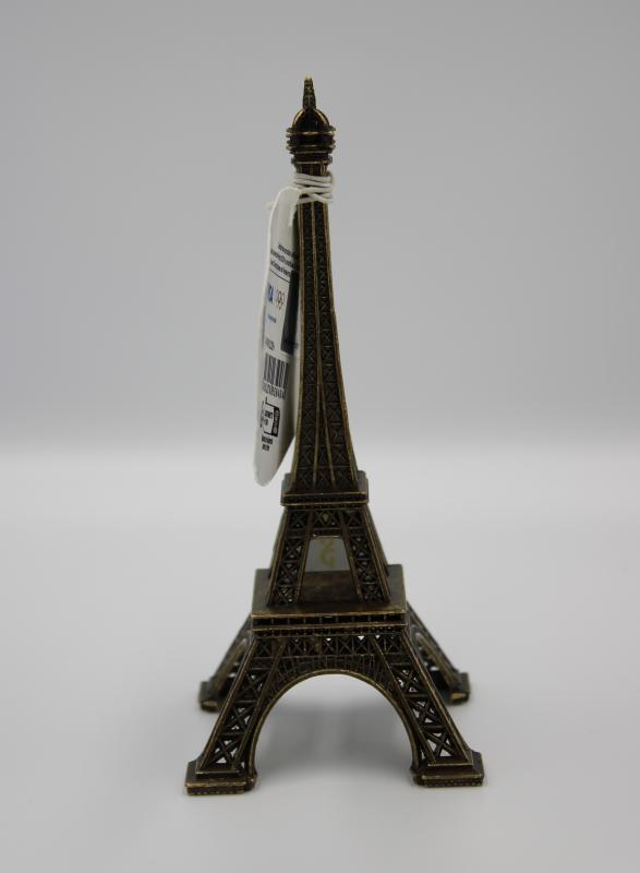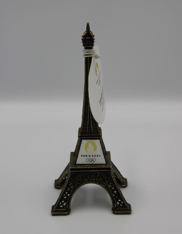 A small Eiffel Tower figurine with “Paris 2024” and the Olympic symbols on the front. The design incorporates “PARIS” and “MADE IN FRANCE,” and it comes with a white tag confirming it as an official product of the 2024 France Olympics.