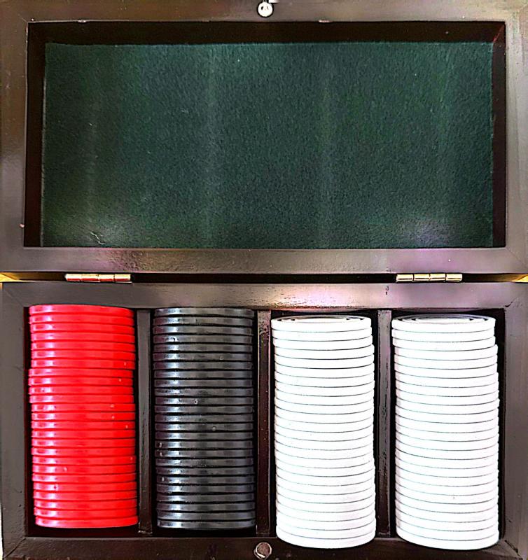 This wooden poker chip box has features of a felt-lined lid and slots to organize the white, black, and red plastic poker chips. The chips reflect the lightweight and effective style common in most late 20th century home poker sets, before the heavier clay compound chips became more accessible. Poker chip cases like this grew in popularity as card games remained a popular American family activity throughout the late 1900s. Its durable construction and classic design connect everyday gameplay to the broader history of home entertainment during that period.