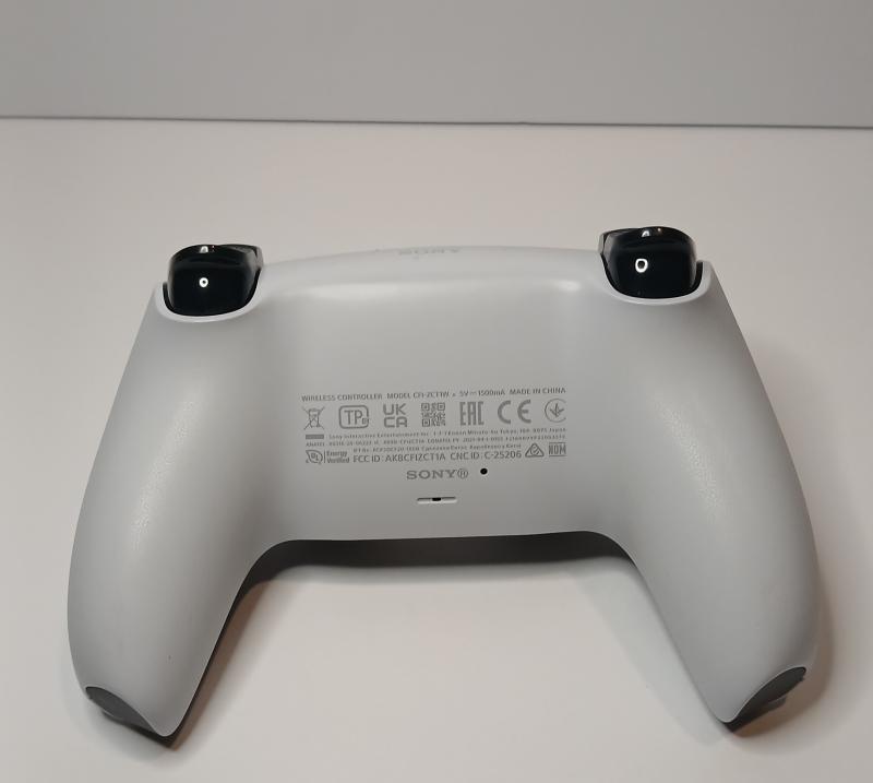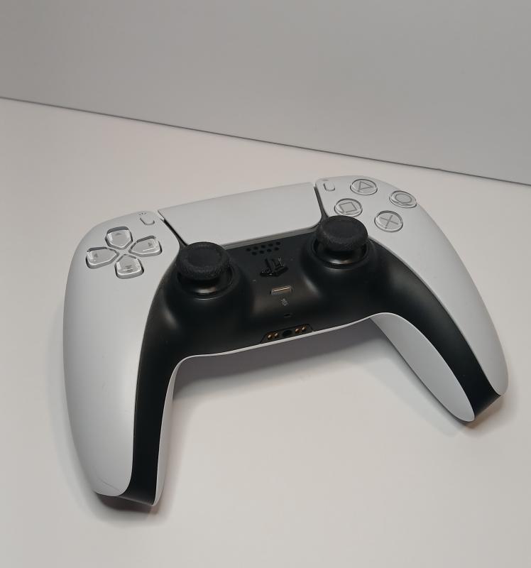 ID: A white and black controller-shaped object, including a PlayStation symbol button in the middle of 2 black joysticks. Directly above is a white panel button with two small buttons on the top corners. On the left are 4 arrow buttons, pointing up, down, left, and right. On the right side of the controller are four more buttons that are made from plastic. These buttons include a triangle, a circle, an X, and a square. Located on the top of the controller are triggers, 2 on each side, and in the middle is a USB-C charging port.
