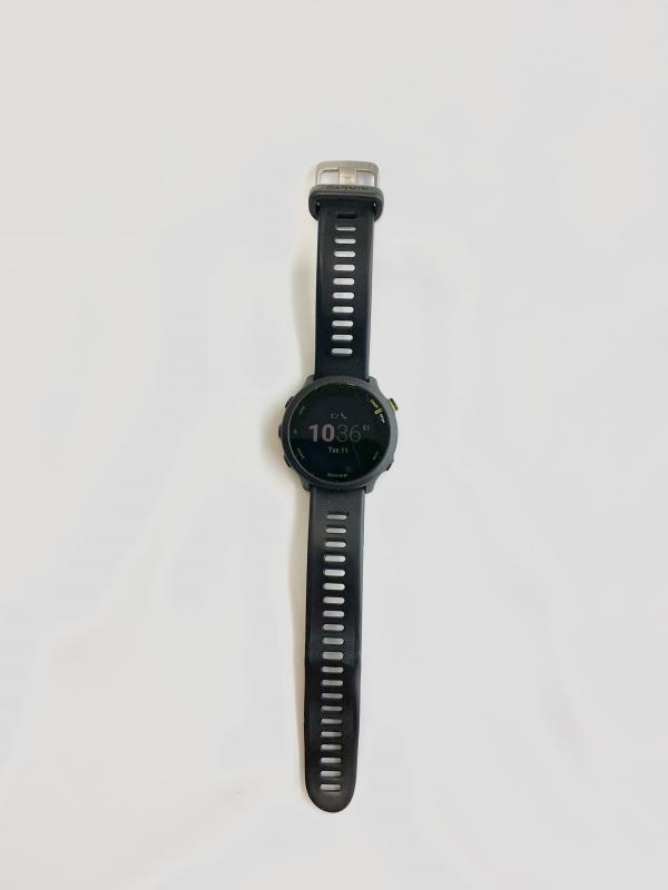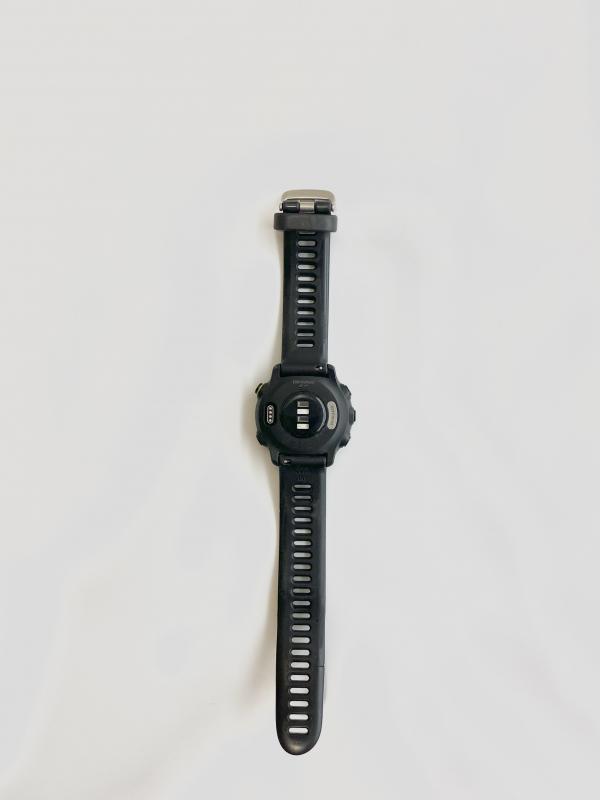 ID: The watch is black, thin, and lightweight. The straps are made of a flexible silicone, with one being slightly longer than the other. The shorter one, ends with a metal tab, while the longer one, has a rounded edge with no accessory. Both straps are perforated with rounded, rectangular holes equally spaced throughout the majority of the straps. There is also a silicone band around the shorter strap that helps secure the excess length of the longer one when the watch is clasped. The display of the watch is rounded, with three small, equally spaced buttons--Light, Up, and Down--that barely jut out lining one side and two buttons--Start/Stop and Back--also equally spaced but with the Start/Stop more prominent and highlighted in green, lining the other. The screen is made of tempered glass with the digital face, surrounded by a slight elevated black ring that indicates the functions of the side buttons and features the Garmin brand name beneath. On the underside there is also a tempered glass, in this case housing the watch's sensor that takes in data for features such as biometrics, and around is the port for the watch charger and information such as watch model, serial number, and place of manufacturing.