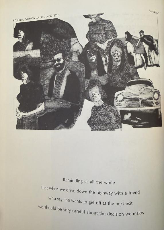 ID: Collage of people and a vintage car above a poem about making careful decisions when traveling with a friend who wants to take the next highway exit.