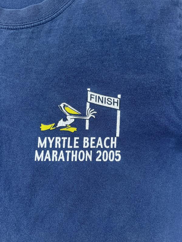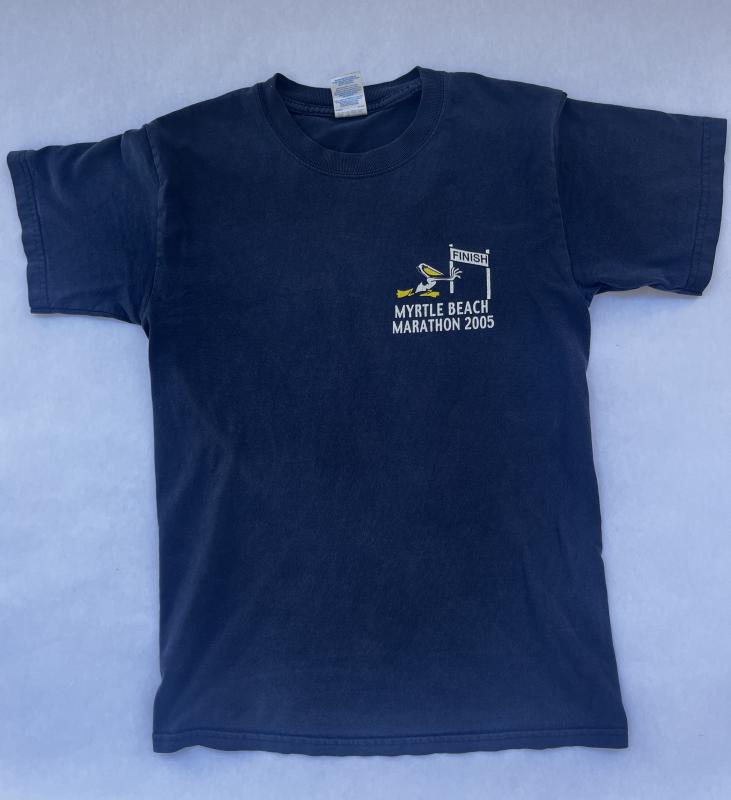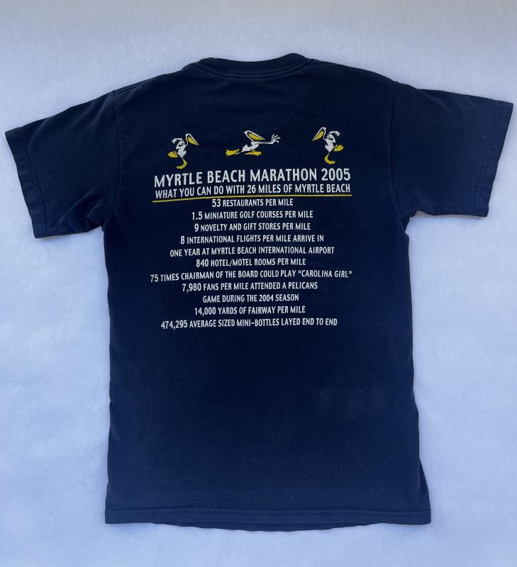 ID: a navy short-sleeved t-shirt with white lettering on both sides. On the front left side of the chest, there is a title “Myrtle Beach Marathon” with a pelican running across a finish line above it. Centered on the back, below the collar, are three pelicans spread out evenly in running positions, with text centered below them, stretching from one side of the shirt to the other. The text explains many of the different things that you can do with 26 miles in Myrtle Beach, listing a few of them are 53 restaurants per mile, 840 hotel/motel rooms per mile, and 14,000 yards of fairway per mile.