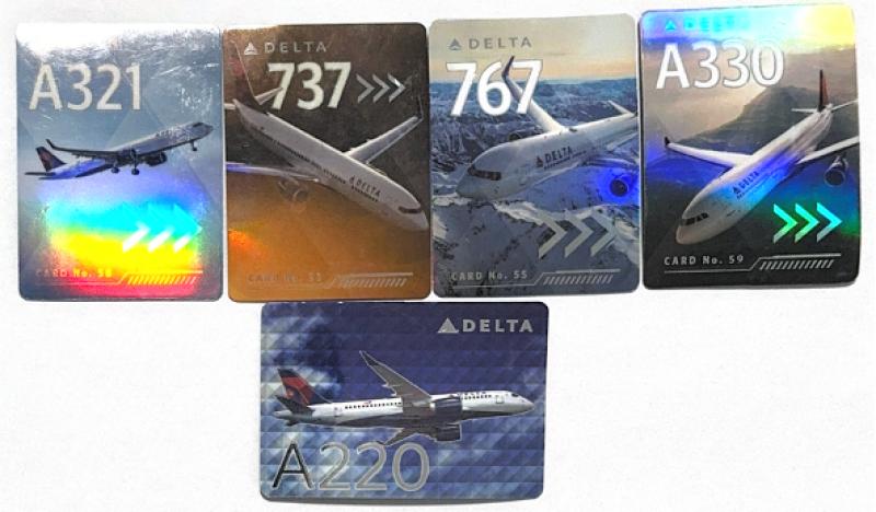 For the set of five Delta Air Lines trading cards commonly given by pilots or flight attendants to passengers, especially kids and aviation enthusiasts. Features a metallic finish photograph of a specific aircraft from Delta’s fleet. The back of each card includes detailed aircraft specifications such as speed, range, engine type, wingspan, tail height, and seating capacity, along with a three-view diagram (top, side, and front). At the bottom of each card, there is a short description of the aircraft’s production, operational history, and general takeoff performance.