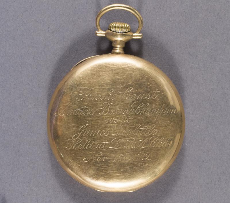 ID: A gold-toned Waltham pocket watch, including the engraved back of the case displaying award text related to a boxing championship. The watch face showing the enamel dial with Arabic numerals and a seconds sub-dial.