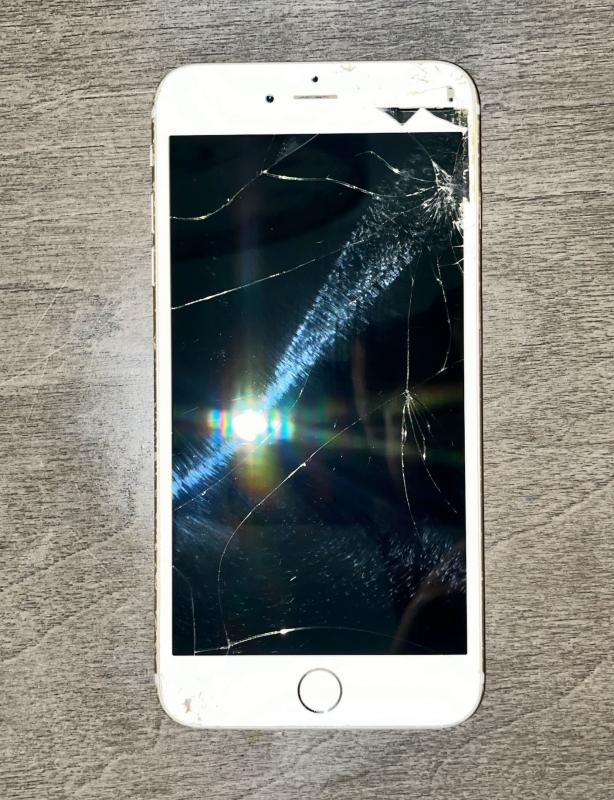 A rectangular smartphone with a white front bezel and a black display screen. It has rounded corners. The front glass is heavily cracked, especially in the top left and bottom right corners, where small pieces are missing, and fracture lines spread across the surface. A circular home button with Touch ID is located beneath the screen. The back of the device is metallic rose gold with visible scratches, chipped paint, and worn areas. It features the Apple logo in the center, the word “iPhone” near the bottom, and a small “s” badge indicating the 6s model, and it has a white outline around the top and bottom. A single rear camera and flash are positioned near the top left corner of the phone’s backside. It also includes a headphone jack on the bottom side, to the left of the charging port.