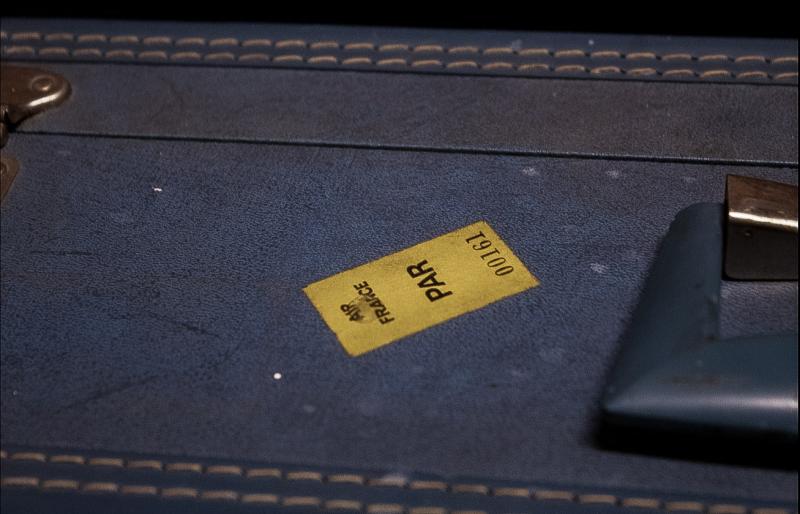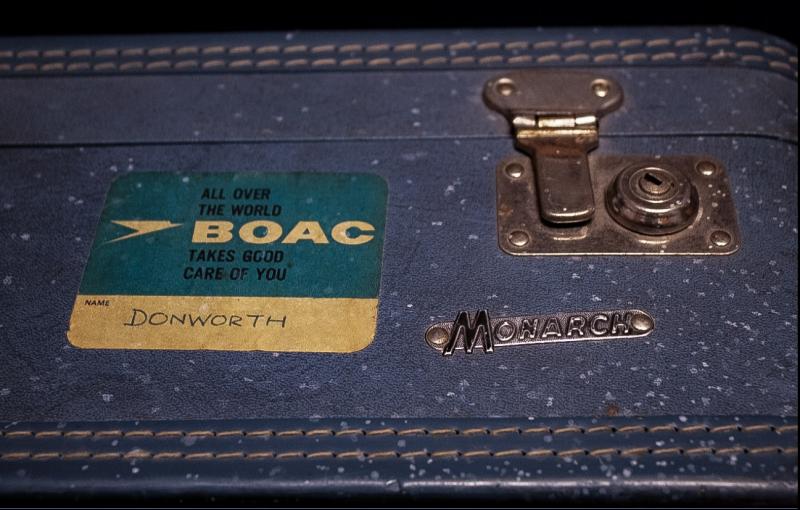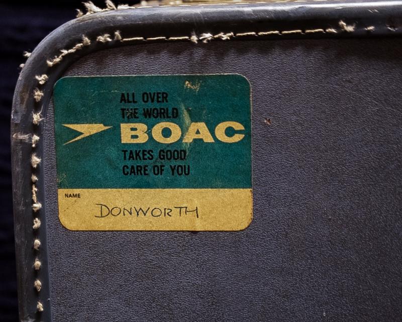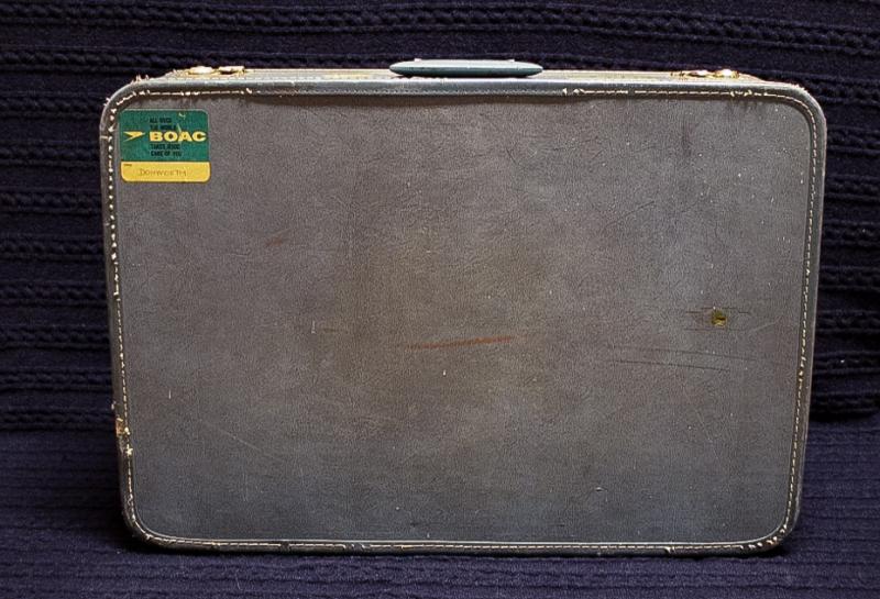 A medium-sized rectangular hard-shell suitcase with a soft blue outer shell. It includes two metal latches and a handle located at the top center. The design follows a curved edge pattern with a sleek and minimalist 1960s style that is smooth and rounded at the edges, better reflecting the modernistic aesthetic. It is compact and flat, without any pockets or outer zippers, enhancing its stackability. Wear marks are light, and scuffs are visible, indicating long-term use. There is a small square yellow sticker on the top half of the suitcase near the handle that says “Air France,” with the abbreviation “PAR” and numbers “00161” beneath it. There is another sticker on the top left of the front side and on the back side of the suitcase, split horizontally into sections of blue and white. The sticker has bold black-and-white letters that read “All Over the World BOAC takes care of you,” with the name “DONWORTH” handwritten in pen in the white section of the sticker.