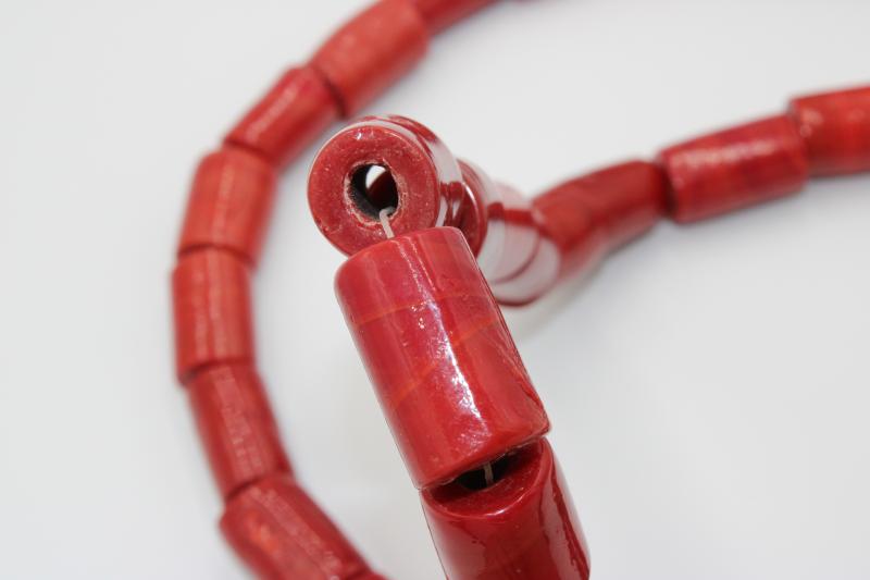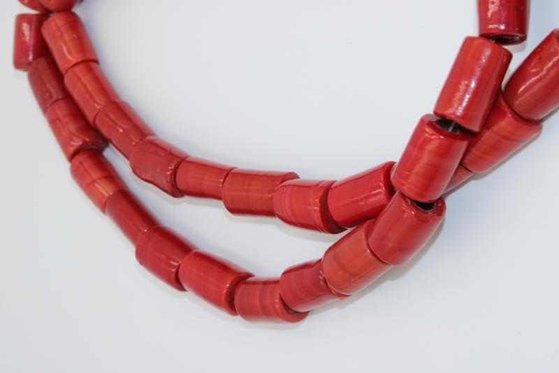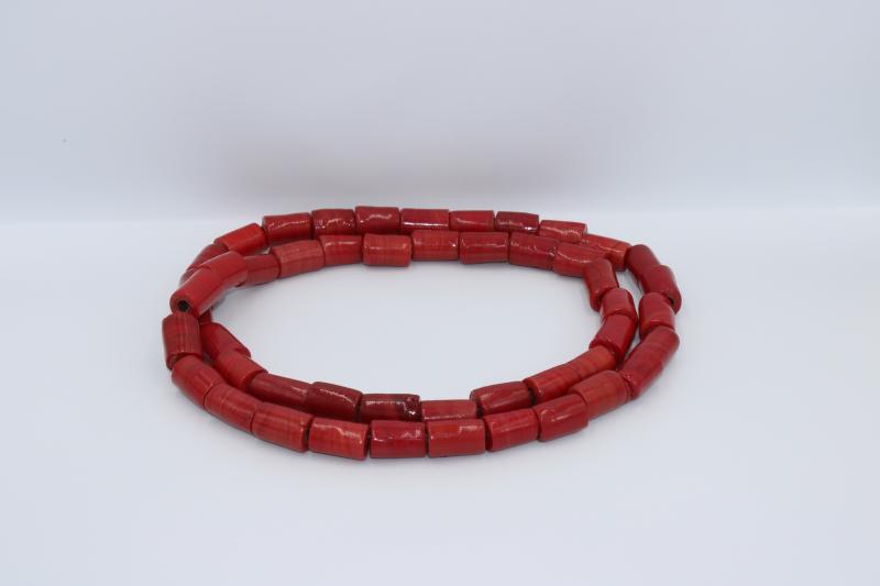 ID: A set of reddish beads, around 2ft in total, with each bead being 1in by .5in. Made of coral stacked on top in a circular pattern, sitting against a white background, with nothing around it. each beads having a different shade of red. Their cylindrical, hand-shaped form features natural texture and organic imperfections characteristic of coral. The set appears polished, with a glossy surface that reflects light, and no other objects are present in the image.