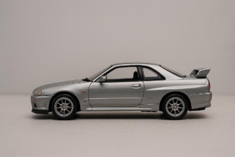 ID: A high-resolution scaled model image of a Nissan Skyline GT-R R34. Low and wide body with rounded front, rounded hood, rectangular headlights, and long back and raised spoiler. High metallic silver paint job with no flaws in the paint and minuscule separation in the panels. Slightly detailed rims with 5 spokes and 1/2 spoke detail of the brake assembly, windows tinted black and reflective. Neutral and flat background for image purposes, as this is a still image to get on display. Palm-sized with properly proportioned elements, all exterior with scaled proportions, no exaggeration or reduction of reality, all without imperfections at this size.