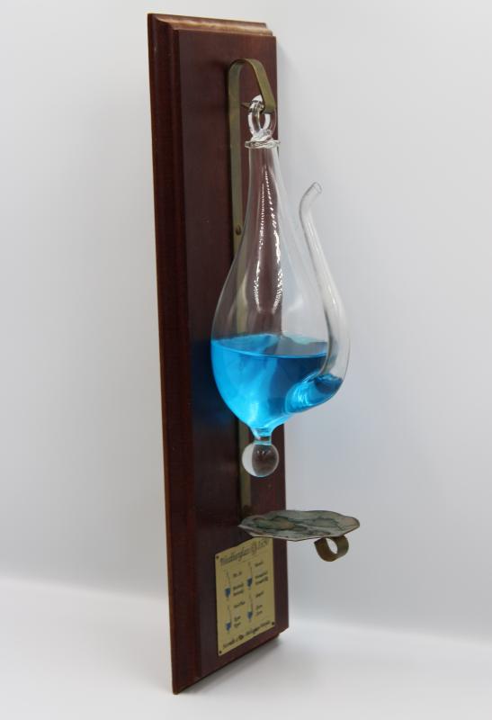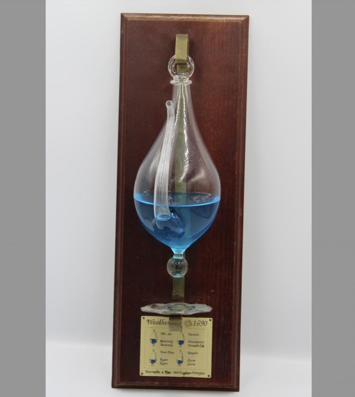 A French weatherglass that uses the elevation of water to predict changes in weather. It is designed to hang off a hook attached to the wall of a boat. The hook is connected to a wooden base with a metal plate on it that explains the implications of the varying water elevations. The water levels adjust based on the humidity of the air, which changes the pressure applied to the water on both portions of the glass. Sailors would use the glass as a form of barometer to predict the weather.