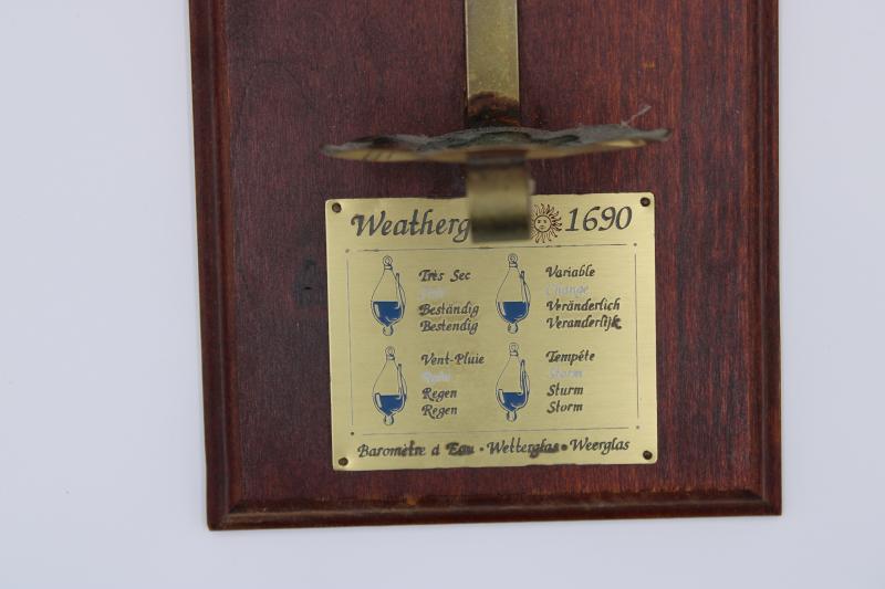 A rectangular wooden plank is attached to a wall vertically. The bottom of the plank has a small metal plate attached to it with four engraved pictures of different water elevations of the weather glass. Next to each image is a descriptor of the weather in French, English, Dutch, and German. If the water in the spout is lower than in the body, the weather is “fair”. If it has slightly more, it is “rain”. If it has much more, it’s a “storm”. If both have equal elevations, the weather is “variable”.