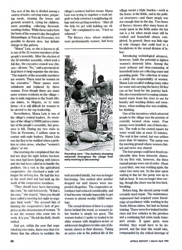 An article found in the "Africa Report" published in 1985. The article is about two African women laboring in Africa and how they use their resources in agriculture to prepare food. The article describes the domestic responsibilities these women take in their roles in their families and societies.