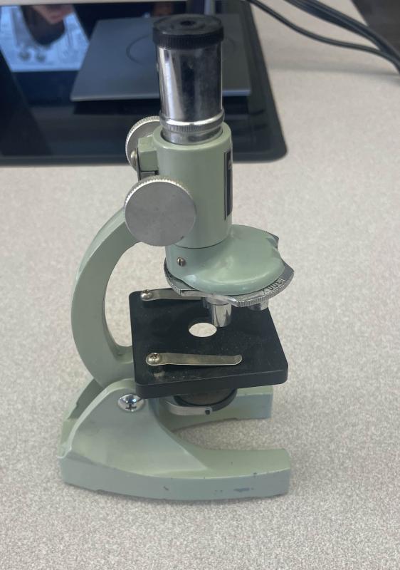 ID: A basic education microscope with a seafoam green colorway. The microscope was constructed with a metal base and upright arm. It has a black eyepiece tube at the top, a rotating silver nosepiece with two or three short objective lenses, and a flat black stage with metal slide clips. Below the stage is a small mirror used to reflect light upward. Also, the focusing knobs are positioned on the side of the microscope arm, roughly halfway between the eyepiece and the stage.