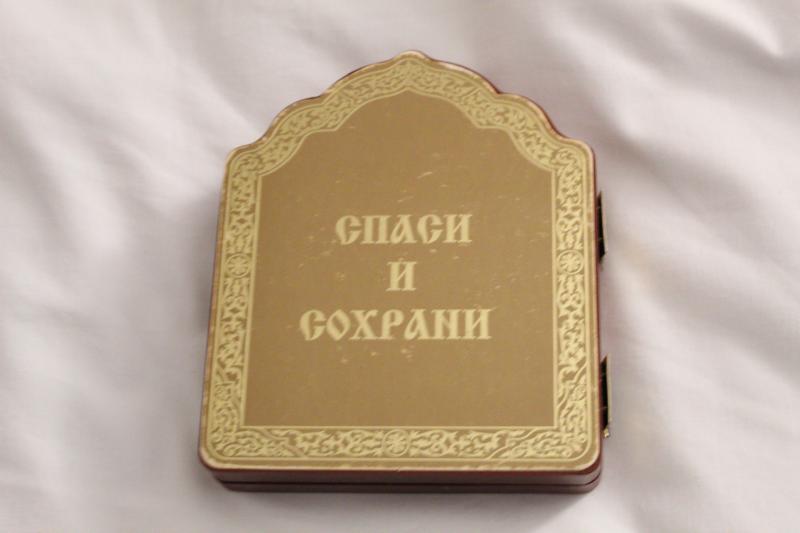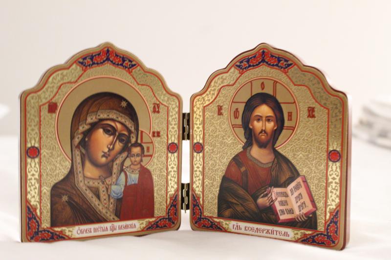 ID: Two wooden icons held together by a hinge. The front of the first icon has a drawing of the orthodox cross. The first wooden icon on the front has a picture of the Virgin Mary of Kazan, with a caption below stating "Image of the Most Holy Mother of God of Kazan". The letters The front of the second icon has a picture of Jesus Christ, the Teacher; the caption below it states "Lord Almighty". On the Back of the second icon, it states “Save and Protect” in Church Slavonic. The letters around Jesus' halo are an acronym from the Greek "He Who Is". There are accents of gold that go around the icon drawings, and the halos indicate holy presence within the persons depicted on the icon.