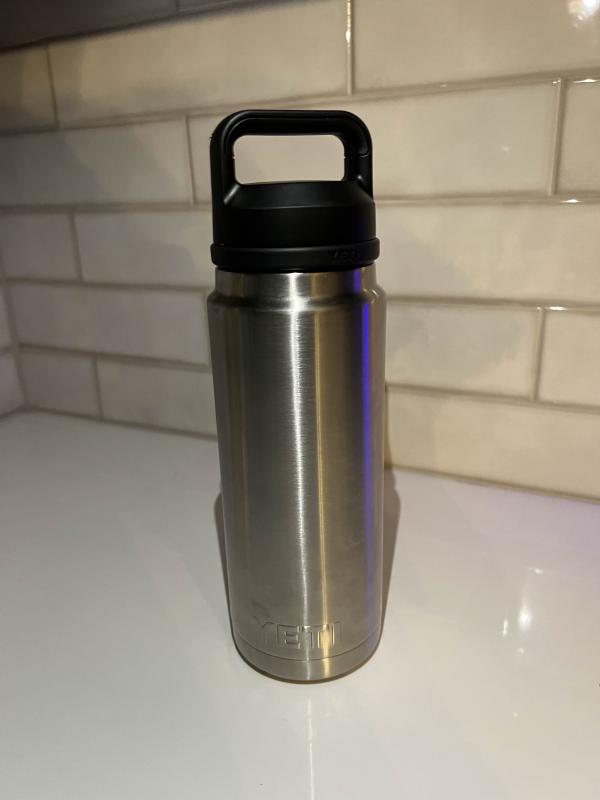 A silver colored Yeti rambler that is made of 18/8 grade stainless steel. It is 26 ounces with double- wall vacuum insulation that keeps drinks hot or cold. This Yeti rambler does not contain any BPA. The Yeti brand specifically started to make drinkware that was durable enough for serious outdoor use.