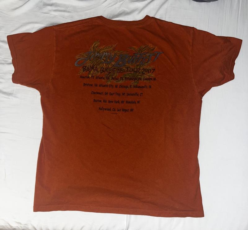 A t-shirt from Jimmy Buffett's 2007 Bama Breeze tour. On this tour he played lots of covers as well as his fans favorite songs. It is an orange shirt with a sun-faded look. The shirt looks worn with a relaxed fit. The front shows an image of a beach, and the back lists all of the tour locations and dates.