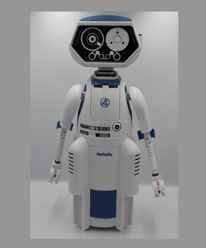 The AMC H.E.R.B.I.E. popcorn bucket is a collectible item from The Fantastic Four movie. It is a multi-functional container for snacks and drinks that includes a large popcorn tub, a candy compartment, and a drink dispenser in the head. It also features interactive elements like posable arms, a button to play the movie's theme song, and a button to project the Fantastic Four logo.