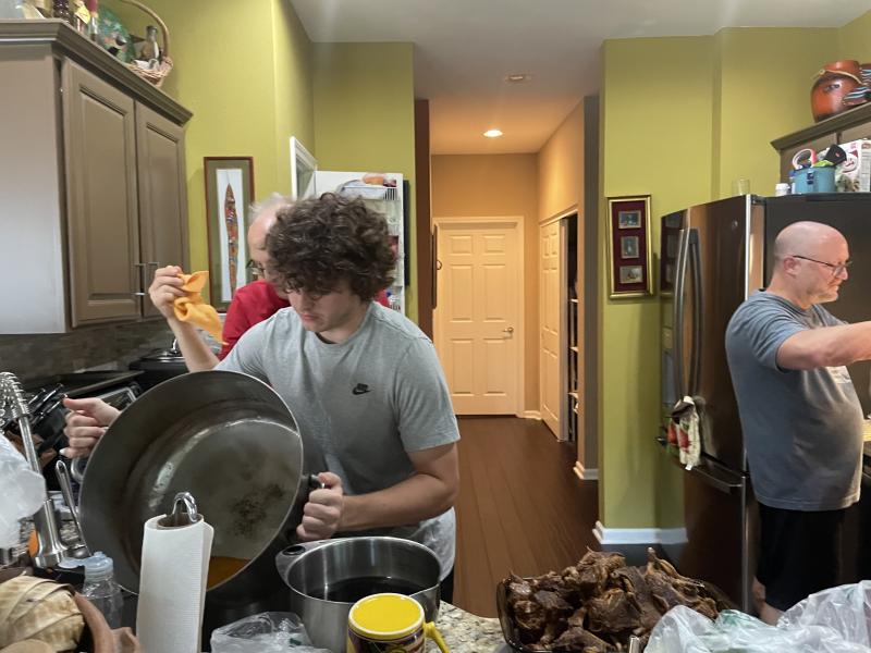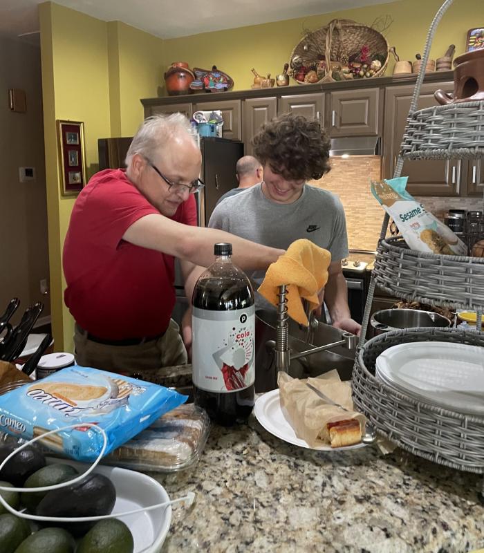 First photo: There is a bald man with glasses in a light blue shirt at the stove just out of frame cooking, a boy in a grey shirt with brown curly hair emptying a large pot in into the sink with meat and a sauce surrounding