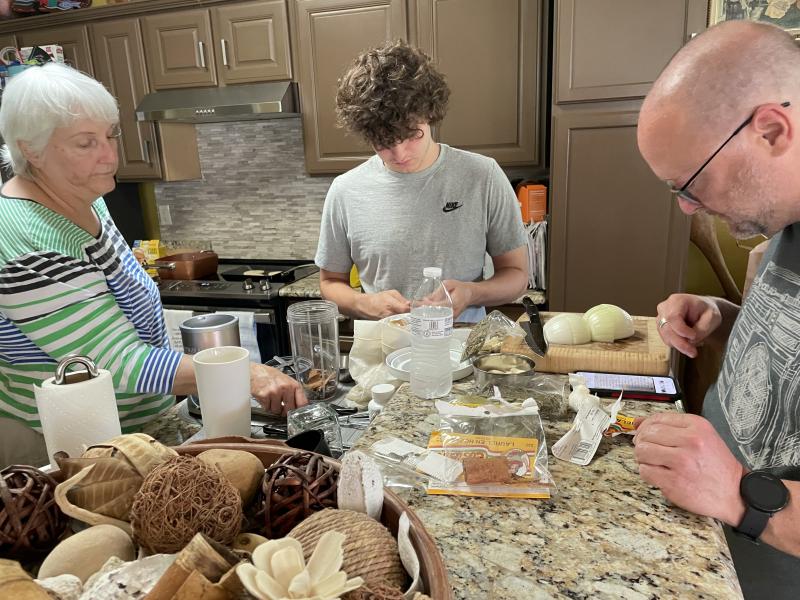Second photo; There are three people surrounding a kitchen counter, it is a bald man in a light blue shirt, a teenage boy in a gray shirt and brown curly hair, and a older woman with white hair in a striped green, white, black, and blue shirt.
