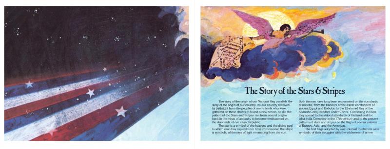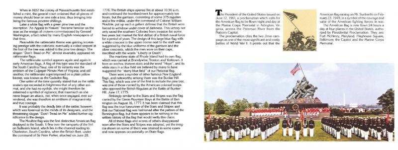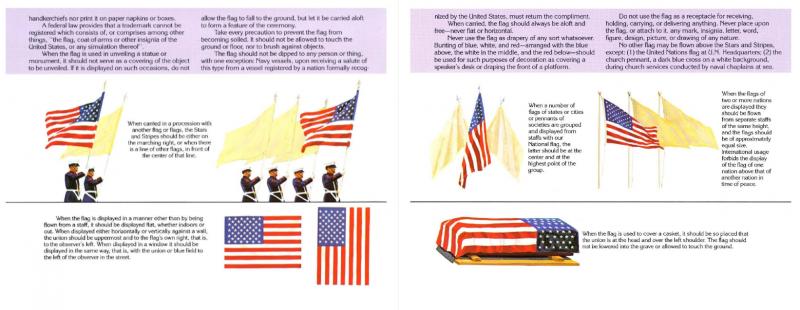 ID: Flag photo one is the book cover, and it features a colorful format of multiple soldiers, wearing blue coats and white hats, marching while one carries a rifle, one carries a red flag with the words “Marine Corps” on it, and one carries the American flag. In the middle ground, there is a crowd of people watching the soldier’s march. In the background, there is green land, blue sky, and some orange depicting a sunrise, and on the cover is the title of the book, How to Respect and Display our Flag. Flag photo two, pages two and three, goes on to explain what the stars and strips of our flag represent, stating that, “the star is a symbol of the heavens and the divine goal to which man has aspired from time immemorial: the stripe is symbolic of the rays of light emanating from the sun,” (Percy Webb). Flag photo three, pages eight and nine, states how whenever a new state joins the Union; a new star is added to the blue part of the flag as of April 4th, 1818. It is also said that the flag became a symbol of both sovereignty and Liberty. Flag photo four, pages sixteen and seventeen, then explains how on June 12, 1961, the American flag is to be flown 24 hours a day at the Marine Corps Memorial in Arlington, Virginia. It serves as a memorial to the Iwo Jima campaign, one of the most significant battles of WWII, and “points out that the American flag… …is a symbol of courage and valor of the American fighting forces in war,” (Percy Webb). Finally, flag photos five and six, pages twenty-six – twenty-nine, shows how to display the flag during certain conditions such as, when it is displayed over the middle of a street it should be suspended vertically with the blue facing north, when it is displayed from an angled staff the blue should go to the peak of the staff, when it is carried with other flags it should be on the marching right, and when it is used to cover a casket the blue should be at the head and over the left shoulder.
