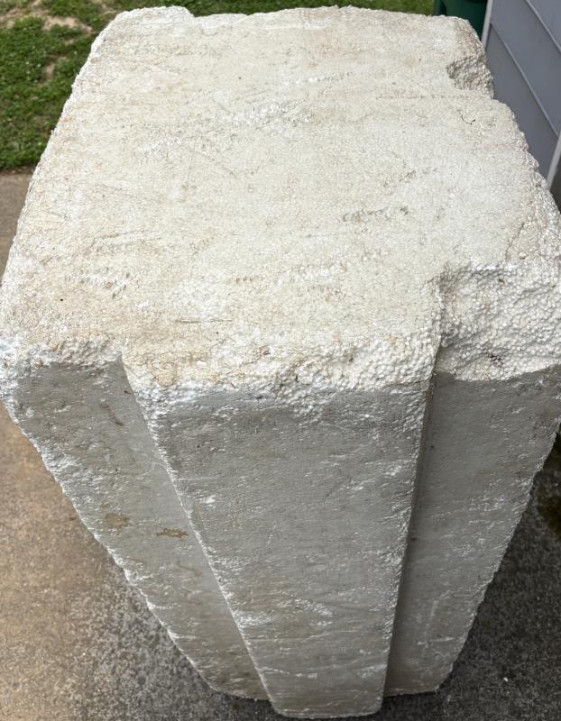 ID: The first photo shows the front face of a 58 inch tall, 32 inch wide, and 23 inch deep white Styrofoam brick. The front face has 2 stickers, and one metal plate attached. The second image is a zoomed in image of the plate detailing the event the prop was used in, and the names of the two people who stole the brick after the concert. The third image shows the top profile of the brick, where the slot in the long faces are visible, which allowed multiple of the bricks to stack on top of each other.