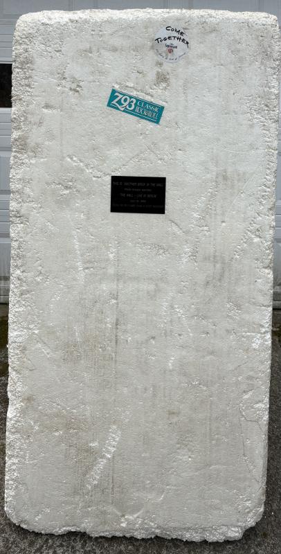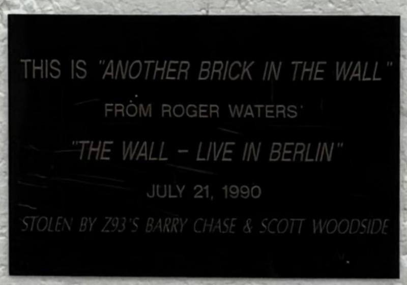 As noted by the plaque attached, the prop was stolen by Barry Chase and Scott Woodside, who were hosts of the Z93 radio show in Atlanta at the time. Chase and Woodside were broadcasting live from Berlin during the concert, and stole the prop to bring it back to the United States after the concert was finished. Back in Atlanta, the radio program hosted a theater viewing of the concert, where they raffled off the brick to one of the attendees.