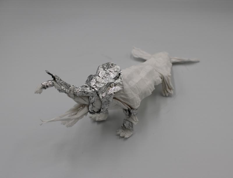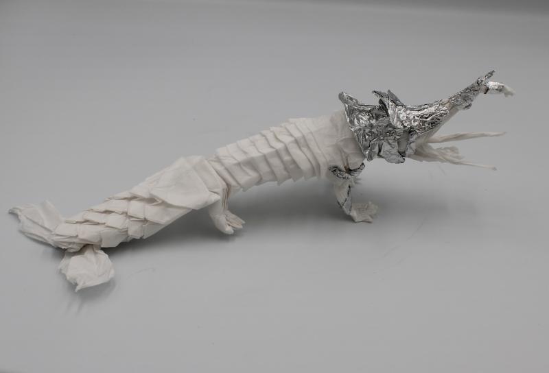 Alt text/ID: This image shows an origami interpretation of a creature called the Makara. The design features a crocodile like creature with a curving elephant trunk and long tusks protruding from the front head of a crocodile. The body of the crocodile features sharp ridges along its back and four large legs each adorned with four sharp claws. The rail features a long and patterned shape of a fish ending in a fan-like shape with the tail being covered in a set of scales. Though not part of original depictions, this model of the Makara includes armor made from aluminum foil. This armor is placed on the creature's head and along its neck covering it in a fan like plating while being added as metal bracelets on the front two legs of the model as well.