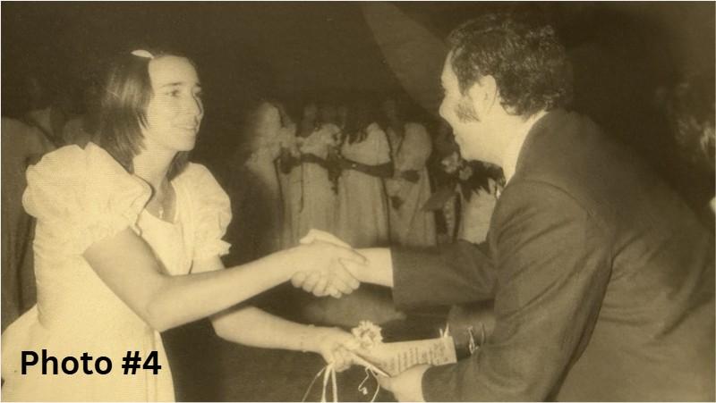 ID: The first photo is a little girl named Leticia wearing white graduating pre-k, her and her teacher, who is also wearing a white dress, are facing the camera while they shake hands. The second photo is her, around 20 years old, and her family at her older brother’s wedding. The third photo is of Leticia with her friends from high school, sitting on a bench watching the boys from her class play basketball. The fourth photo is Leticia, wearing a white dress smiling, and her teacher wearing a black suit shaking hands, she was receiving her diploma from college. The fifth photo is from that same day, with her family celebrating her graduation. The sixth photo is a family portrait with her and all her 8 siblings. They are posing and smiling at the camera.