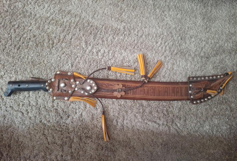This object is a machete obtained by a family member while deployed for Operation Desert Storm and passed down through family members. The machete itself has a decorative leather sheath, a black handle, and a long slightly curved steel blade. The blade shows surface ware but seems fairly well maintained. The sheath is made of brown leather and features metal studs, braided cords, and tassels. The writing on the sheath makes out “Guatemala” maybe indicating where it was crafted. This machete was passed down through family members.