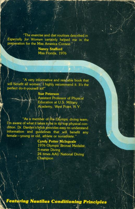 ID: The image shows a book that appears to be worn from age and use. The front cover reads "Especially for Women" with Ellington Darden, Ph.D. at the bottom. It also has a selection of pictures with women running and working out. The back cover shows various quotes of elite level female bodybuilders and athletes giving kudos to Dr. Darden's book along with the words "Featuring Nautilus Conditioning Principles" at the bottom. Both the back and front cover have considerable scratching, with the edges of the book having rubbing damage.