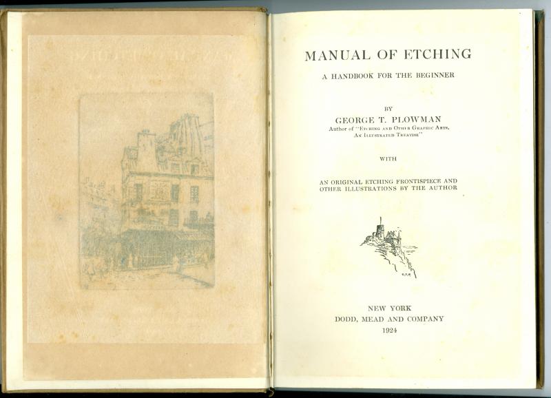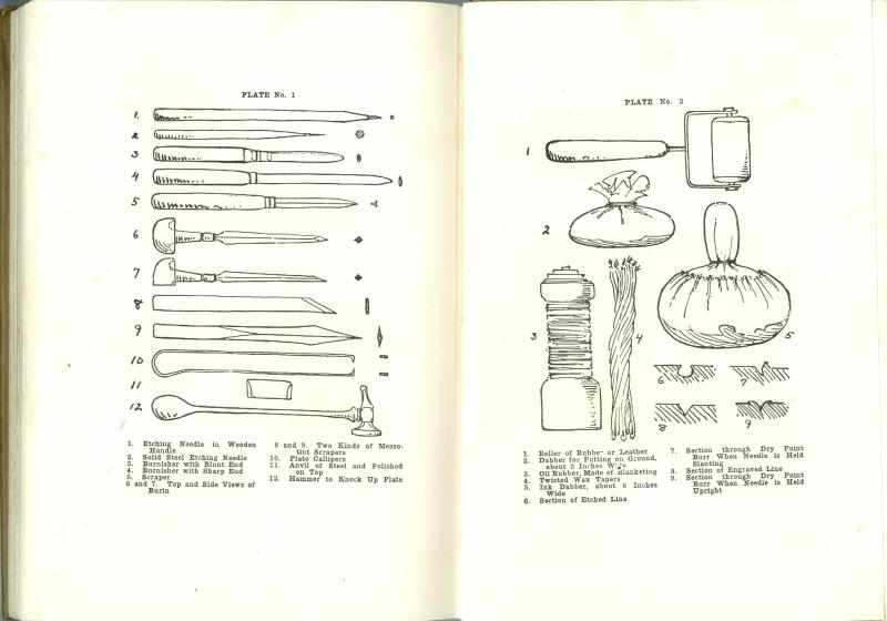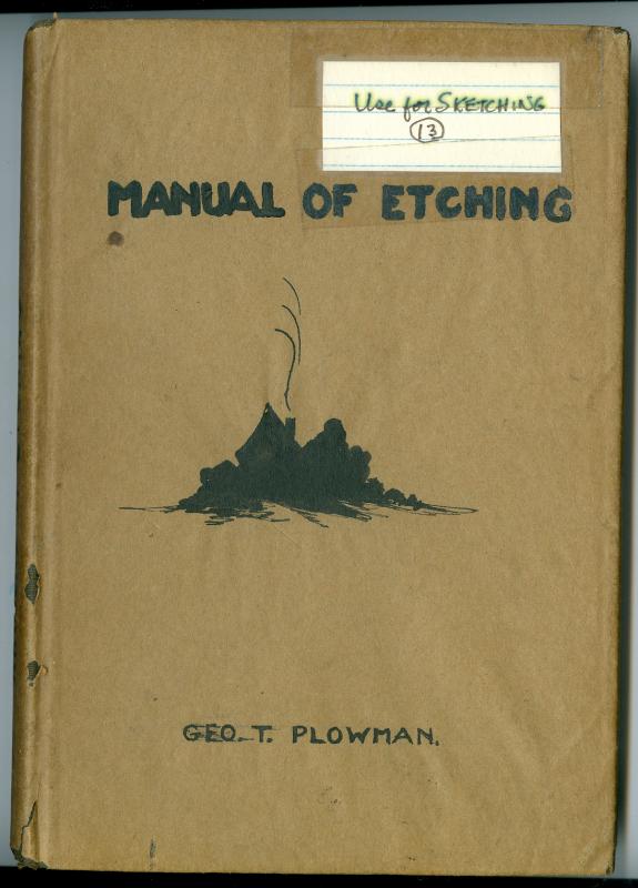 The text is printed on cream colored paper. Approximately 94 pages. 3 photos are shown with the first picture showing the cover of the manual upright stating "Manual of Etching" and "George. T Plowman." The second picture stating, "Manual of Etching; a handbook for the beginner-by George T. Plowman, author of "Etching and other graphic arts, and illustrated treatise with New York, Dodd, Mead and Company." The third photo illustrates a set of different equipment used for etching.