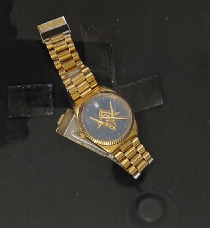 Masonic watches are a type of watches that have symbols such as a square and compasses, the letter "G", and other meaningful emblems. The one above has a gold frame with a navy background. George Bread-belt, Silas Hoadley, Sir Seth Thomas, and Tiffany's.