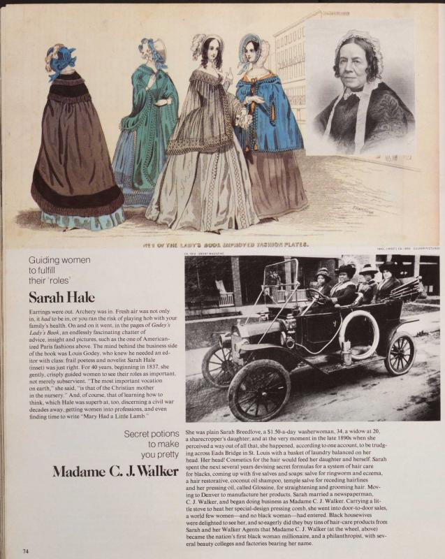 Sara Breedlove aka Madame C.J. Walker is driving a car with 3 other “Walker agents.” The article describes Walker’s young adult life, and the moment that inspired her inventions: hair care products for African Americans including 5 salves and a pressing comb for styling. In addition to her contributions to the advancement of African American hair care, she was also recognized as one of the first women, and the first black woman, to do door-to-door sales. The article also recognizes her as the first African American woman to become a millionaire.
